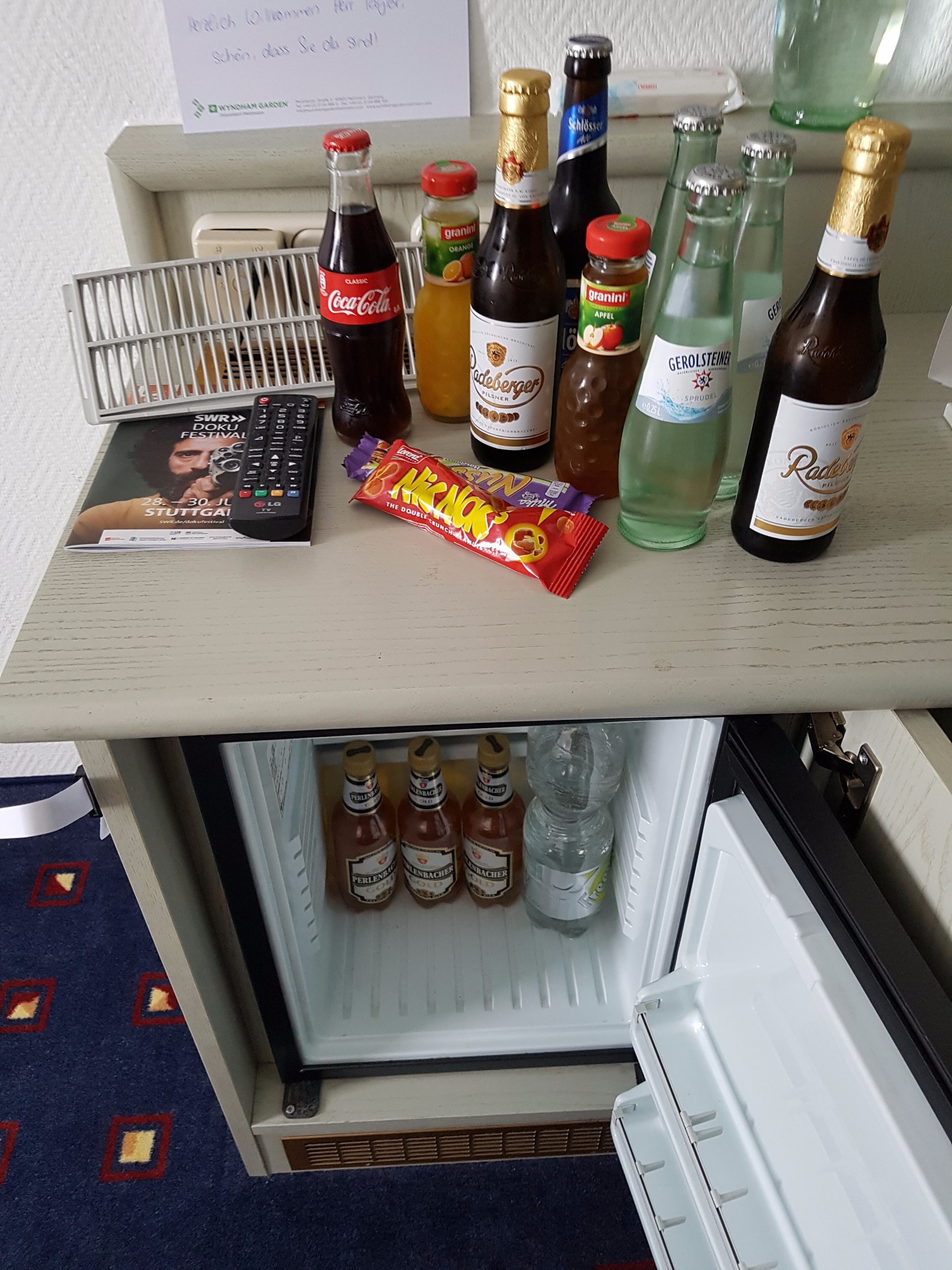 Grüsse aus Düsseldorf. Mal wieder Fortbildung. Die Minibar ist auch schon im Cub-Stil umgerüstet. Gesamtkosten des heutigen Abends: 1€