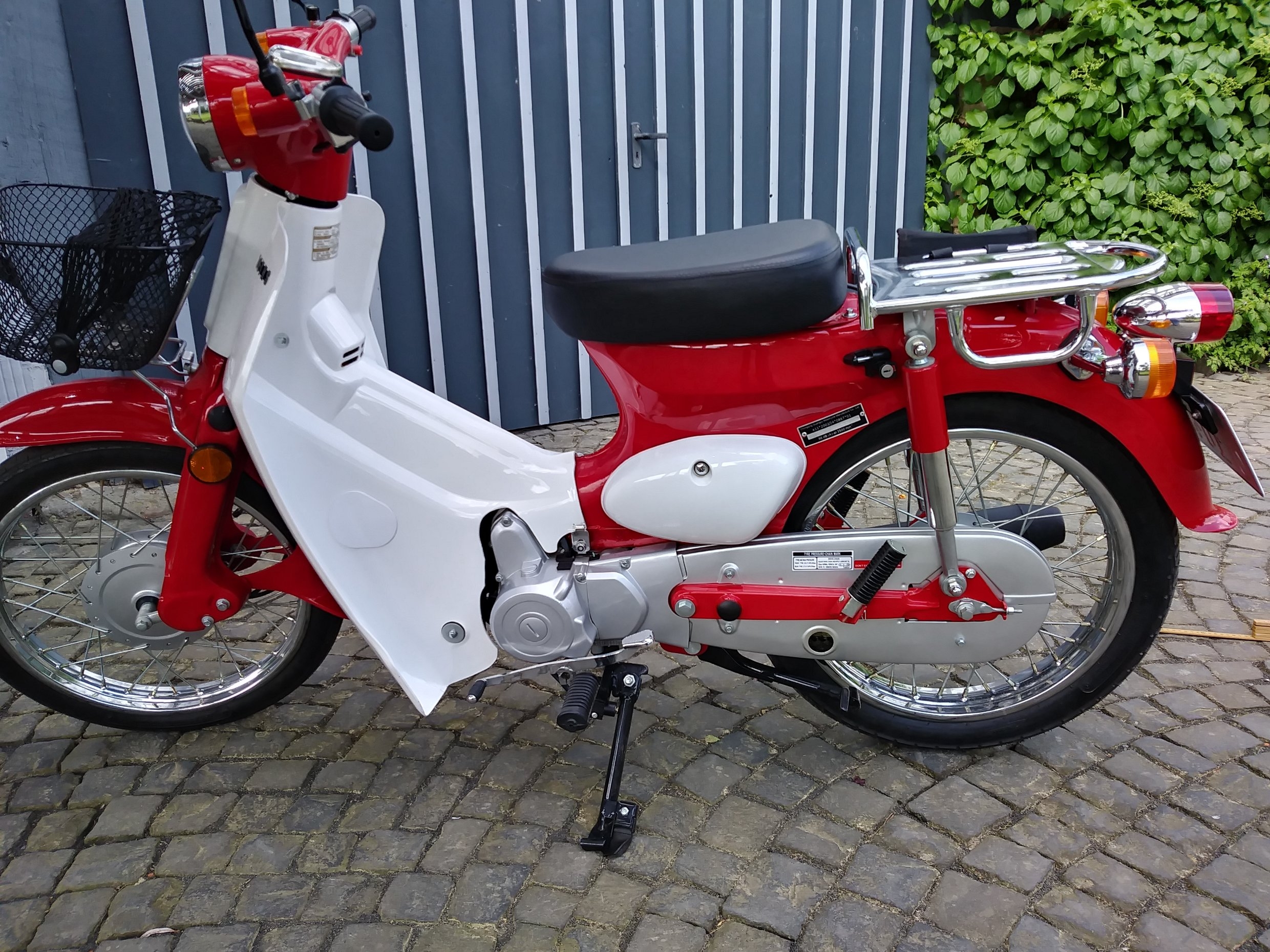 letzten Donnerstag hab ich mir eine Honda Super Cub Replica, 110 ccm, rot-weiss, gekauft! Nach längerer Suche hab ich sie bei Ebay-Kleinanzeigen entdeckt, dabei hab ich bemerkt, dass sie letztes Jahr schon mal zum Verkauf stand. Das Inserat wurde dann aber wieder gelöscht, da den Verkäufer zu viele Dummschwätzer angerufen hatten, wie er sagte. Nun wurde sie eben wieder angeboten, da der Verkäufer Platz brauchte. Ich hab lange überlegt (ich hab schon zwei Roller und eigentlich auch keinen Platz) bin dann aber hingefahren. Das Moped war quasi neu mit nur etwas über 400 (i.W. vierhundert) km auf dem Zähler. Die Verarbeitungsqualität ist... na ja.