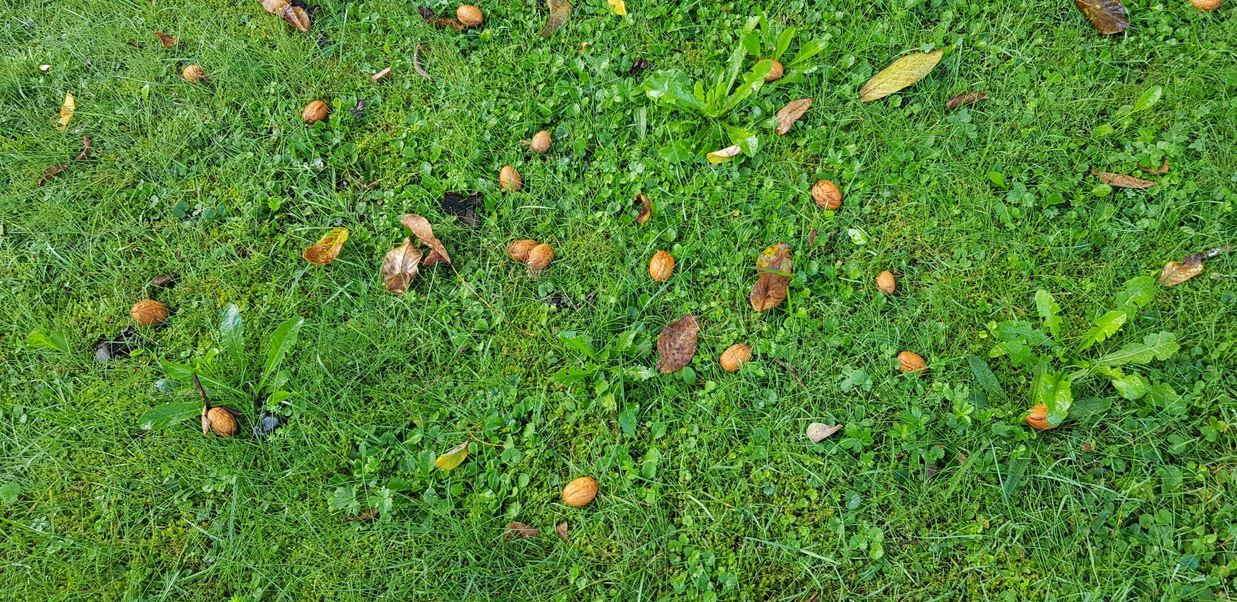 Heut morgen sah es an der Randlage drunter so aus: Ein, zwei Schritte weiter, einmal in die Hocke und um mich rum einsammeln musste ich abbrechen, weil beide Jackentaschen voll waren: Und der Baum ist noch voll davon