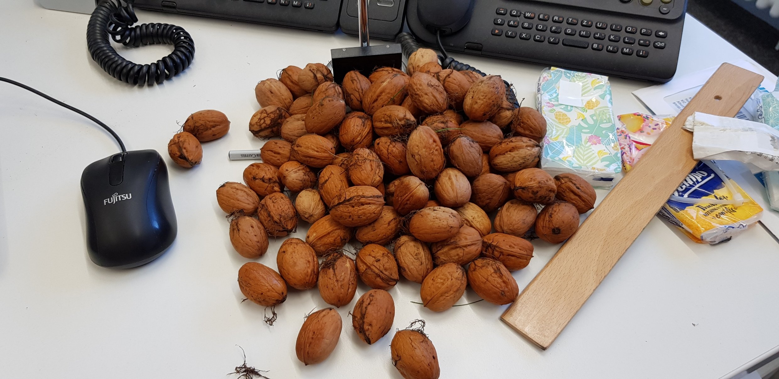 Kommt vom Baum runtergeschossen und rast über eine Schicht Walnüsse die ca eine Fläche von ca 20m Durchmesser bedecken. Irgendwo am Rand bleibt es kurz aufrecht sitzen, schaut sich verstohlen um, rast dann an den anderen Rand der Fläche über tausende von Nüssen hinweg auf offenbar auf eine bestimmte Nuss zu, stoppt davor, richtet sich auf, schaut sich um, sichert, wittert, schnappt sich die Nuss, richtet sich auf, sichert, wittert, rast dann damit zurück an den anderen Rand der Fläche wieder über tausende von Nüssen hinweg, stoppt inmitten von vielen anderen Nüssen, richtet sich auf, schaut sich um, sichert, wittert und hämmert dann diese einzelne Nuss irgendwie in den Boden. Dann bleibt es kurz aufrecht sitzen, schaut sich verstohlen um, rast dann wieder über tausende von Nüssen hinweg zurück auf den Baum. Ein paar Minuten später wiederholt sich das Ganze. Da verlierst den Respekt vor der Tierwelt. Völlig Plem-Plem