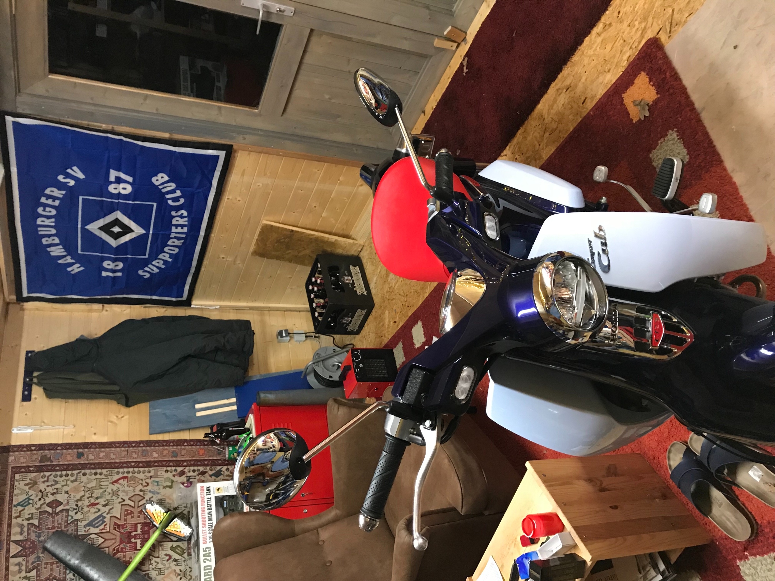 Bin heute ca 40 km gefahren, 20 Land- und Dorfstrassen, 20 Bundesstrasse. Die SuperCub ist straff gefedert, Kopfstein kein Vergnügen, aber kein Scheppern, nichts wackelt, alles an der Maschine ist hochwertig und gut verarbeitet. Am meisten Spass macht Beschleunigen im dritten Gang. Also quasi lautlos im fast-Standgas durchs Dorf fahren, und dann unter den überraschten Blicken bobbobbob Gas geben. Ab 62 kmh im 4. Gang wird Motor rauher, Vibrationen, weiss nicht ob das Einfahrgeschichten sind oder normale Geräusche, ich werde also weiterhin sehr schonend fahren. Danke auch für den Tipp Lenkerspiegel Verbreiterung, hab mal jetzt bei Amazon irgendwas mit 10mm bestellt, so 2 schwarze Alustückchen, zum Ausprobieren, wenn das klappt kann ich ja immer noch Original Hondateile nehmen, was mir jetzt aber zu lange dauert.Die Schalterei geht jetzt flüssig, ohne Nachdenken oder runtergucken. Toll wie gutmütig die SC alles hinnimmt. Hier in der Gegend fährt viel Simson Schwalbe, auch weil die per Einigungsvertrag 63 kmh fahren darf, und die Silhouette der SC täuscht viele Eingeborene. Eigentlich hab ich die SC gekauft, weil die Schwalben mit sensationellen 63 kmh mich auf meiner Peugeot immer abgeledert haben.