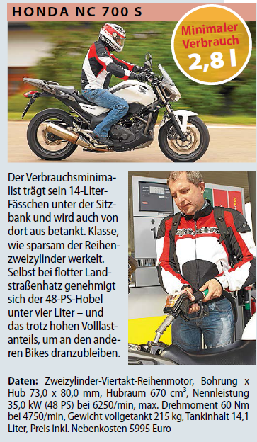 Die Super Cub 110 (wohl der gleiche Motor wie in der Wave) ist übrigens bei 60 km/h mit 62 Kilometern pro Liter (umgerechnet 1,6 l / 100 km) angegeben (siehe Anhang). Die 125 er wird wohl kaum darüber liegen, wenn überhaupt. Größere Hubräume sparen nicht immer. Am meisten haben mich die 2,8 l / 100 km überrascht, die die Zeitschrift "MOTORRAD" mal mit einer Honda NC 700 ermittelt hat.
