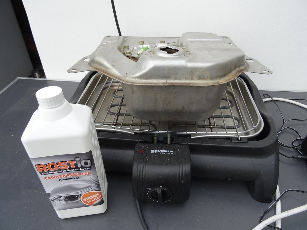 Die Batterie war natürlich platt. Die war schnell bestellt für 17,- inkl. Versand (und mal wieder ohne Pfand berappen zu müssen ;) ). Für den Tank habe ich dann mal den in vielen Foren empfohlenen Rostio-Tankentroster probiert. Eigentlich war ich skeptisch weil ich dachte das Rost im Tank nur mechanisch zu entfernen ist. Aber probieren geht über studieren und das Resultat nach 36h hat mich umgehauen. Der Tank ist völlig rostfrei geworden und sieht aus wie neu: