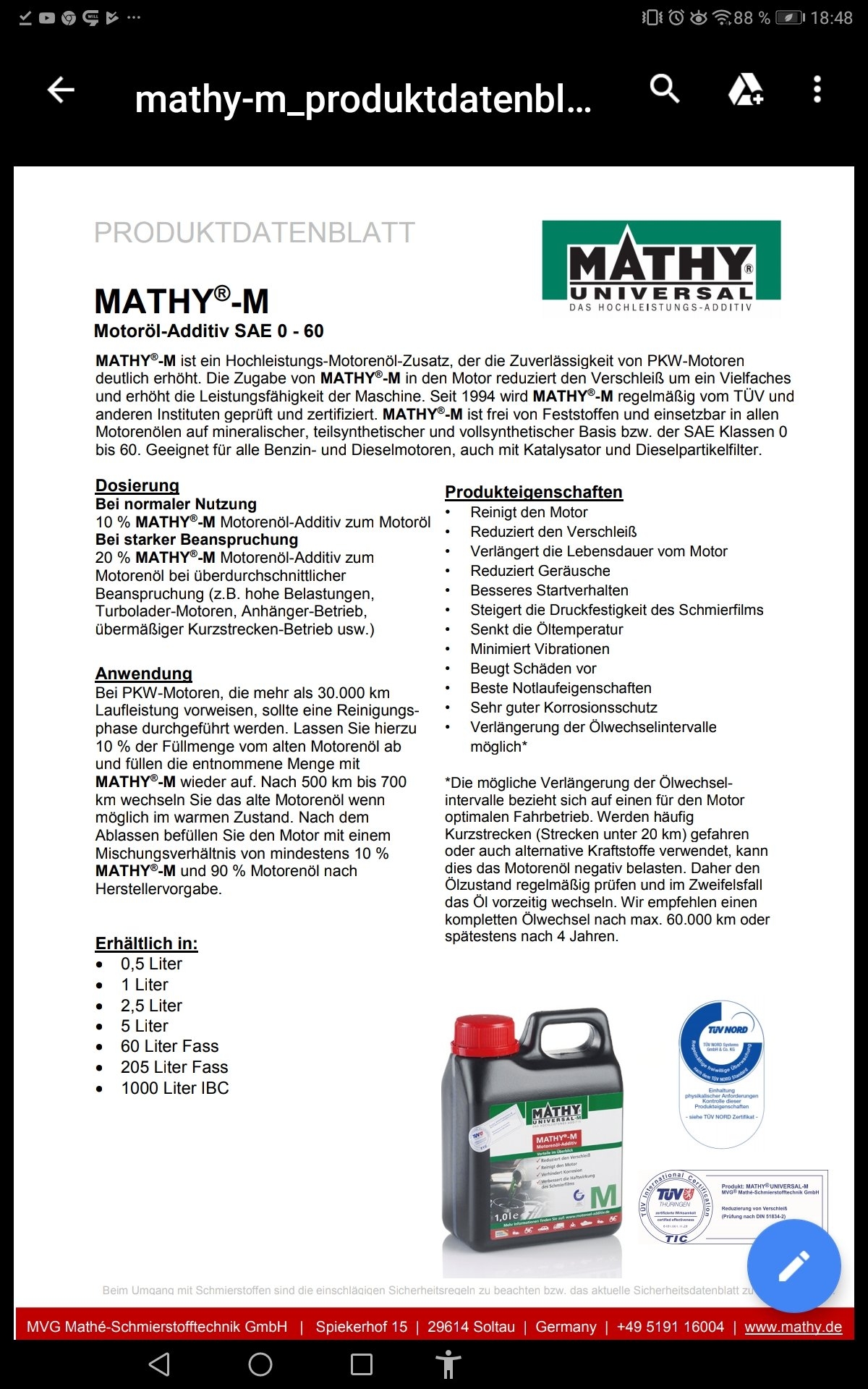 Seit Tachostand 60000km immer an Bord: Nachfüllflasche mit einem Liter 10W40. ich hab noch ein großes Gebinde vom Polo zuhause, da wird immer wieder umgefüllt. Die Nachfüllflasche war am Freitag noch randvoll, heute konnte ich etwas Mathy M einfüllen und komme jetzt auf ein Mischungsverhältnis von ca 5%. Noch zwei Tankfüllungen, dann passts, dass ich auf die empfohlenen 10% komme.