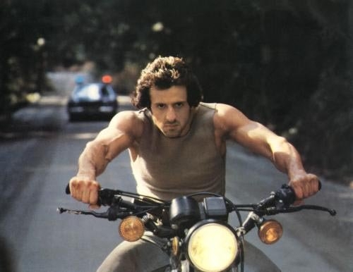 anbei ein äusserst seltenes Foto von Rambo, auf einer Honda c125 SuperCub oder Derivat (für das Double), im 2.Gang bei 60kh, immer noch beschleunigend.