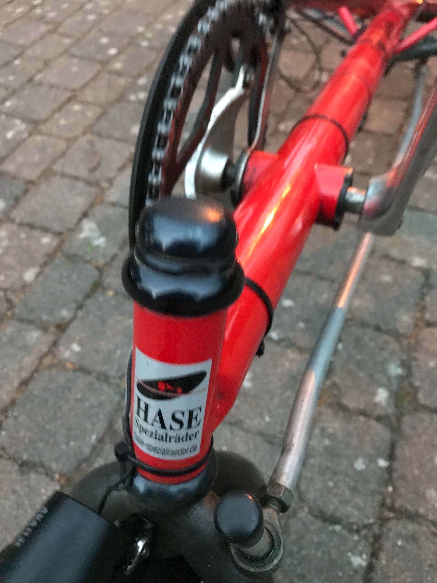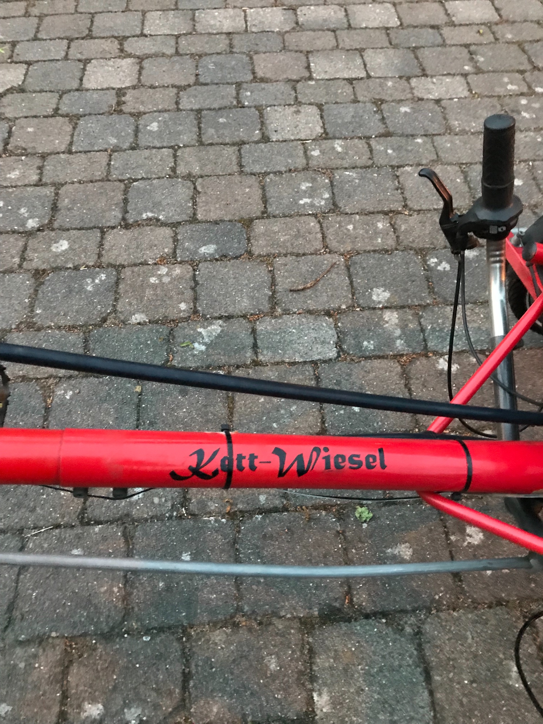 Anbei ein Foto von einem Original Kettwiesel, von Spezialradbau Hase. Ist ein Rennrad mit ganz dünnen Schwalbe Reifen, französischen Ventilen, negativer Sturz, total supertolles Kurvenverhalten, 7 Gang, ein Traum. Hab ich mir 1998 für 2000 Mark gekauft und 3 Jahre im Senegal genutzt, dann in Tunesien, dann in Deutschland hauptsächlich Garage.