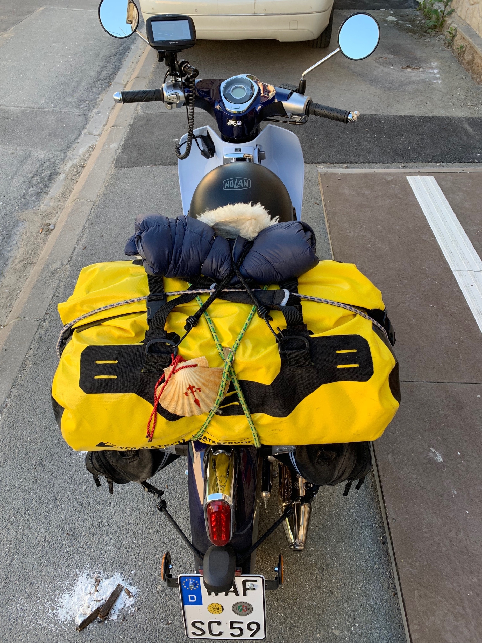 Nach den ersten ausgiebigen Probefahrten mochte ich die Kleine mehr und mehr und der Plan reifte, mit der Cub nach Santiago de Compostella zu reisen. Selbstverständlich nicht auf Autobahnen, Kraftfahrstraßen und ähnlich ungemütlichem, sonder nur kleine und kleinste Straßen und Wege. Auf den Kennenlerntouren wurden ca.600 km absolviert und der 1.Ölwechsel gemacht. Die Planung erfolgte mit Hilfe des Programms "kurviger.de". Empfehlenswert!