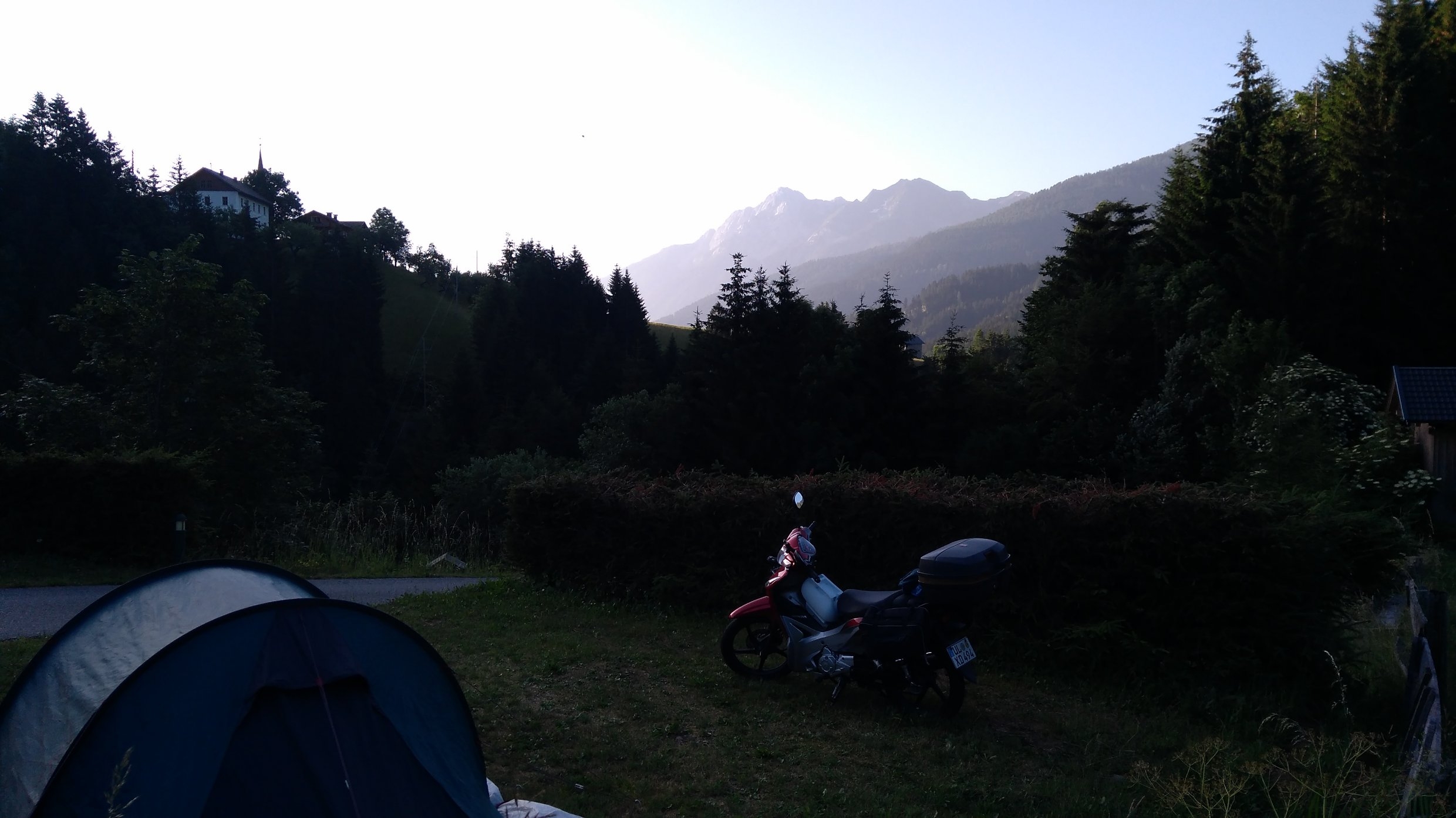Erste Station am Camping Lesachtal, schöner Platz, komplett leer, netter Wirt, am frühen Morgen trifft man ein paar ältere Damen vom Dorf im platzeigenen Freibad.