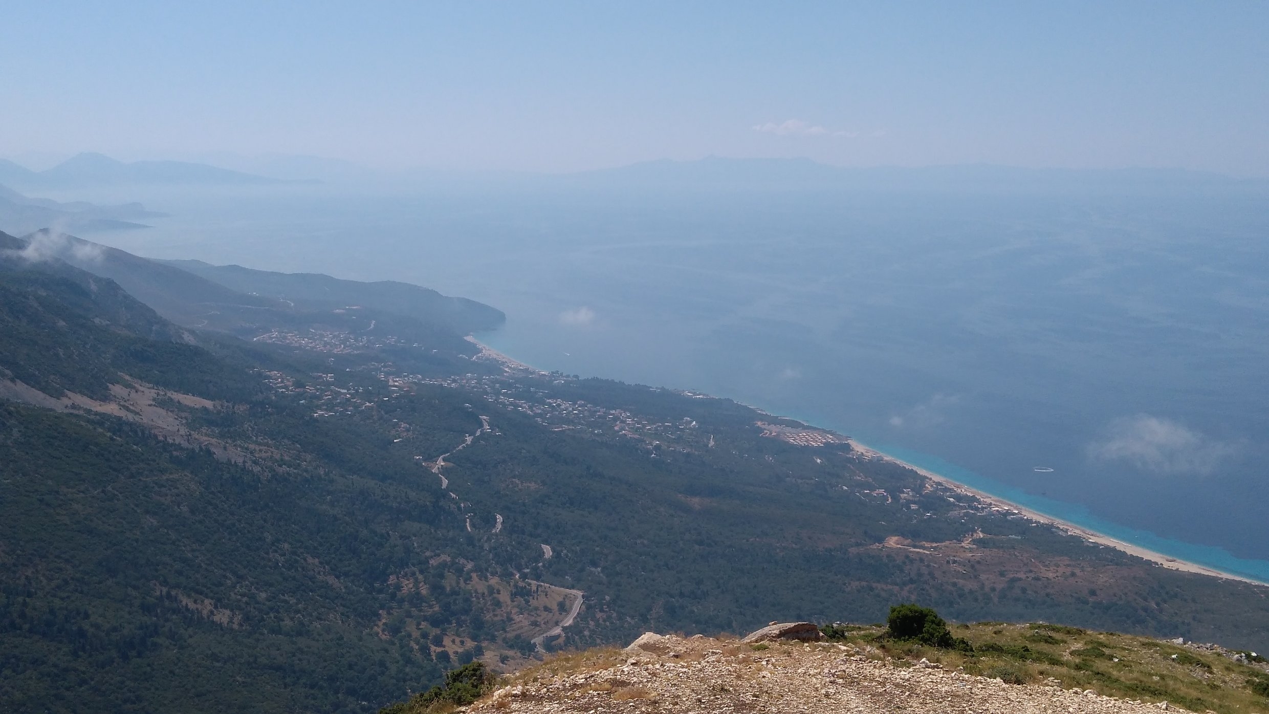 Weiter geht es steil hoch über den Llogara-Pass, von oben hat man eine tolle Aussicht über die Küste. Die weitere Strecke am Meer entlang ist sehr interessant, tolle Badestrände, Ortsdurchfahrten, eine aufgegebene U-Boot-Basis bei Porto Palermo, blühende Agaven. Bei Konispol vor der Grenze fahre ich noch hoch ins verschlafene Zentrum, in dem kleinen Laden wird einwandfreies Englisch gesprochen.