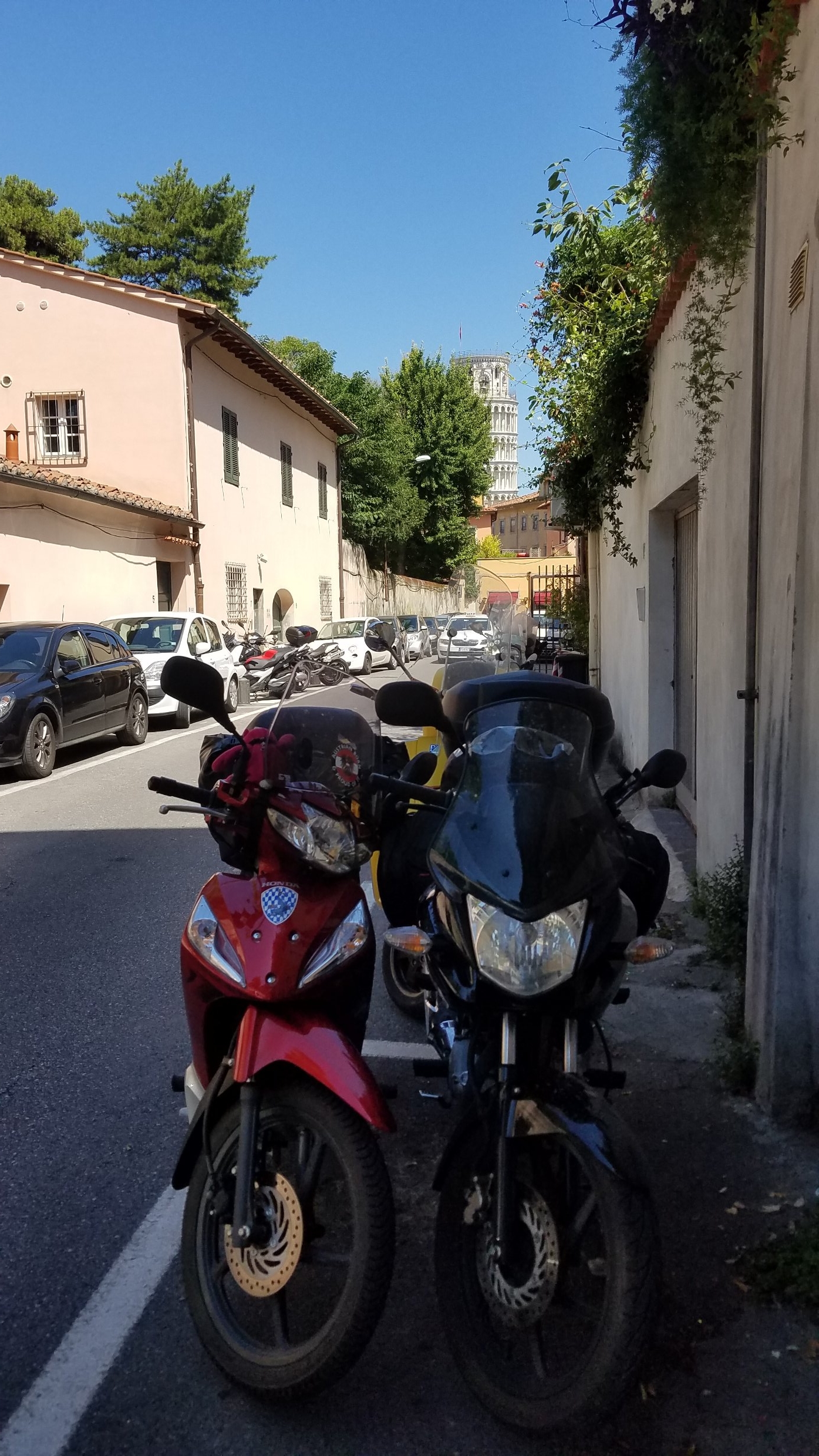 Oben am Passo herrscht gerade das Motorradchaos. Jeder versucht sein Gefährt wenn möglich geschützt an Hausmauern oder noch besser unter Vordächen abzustellen und türmt danach in eines der Restaurants.