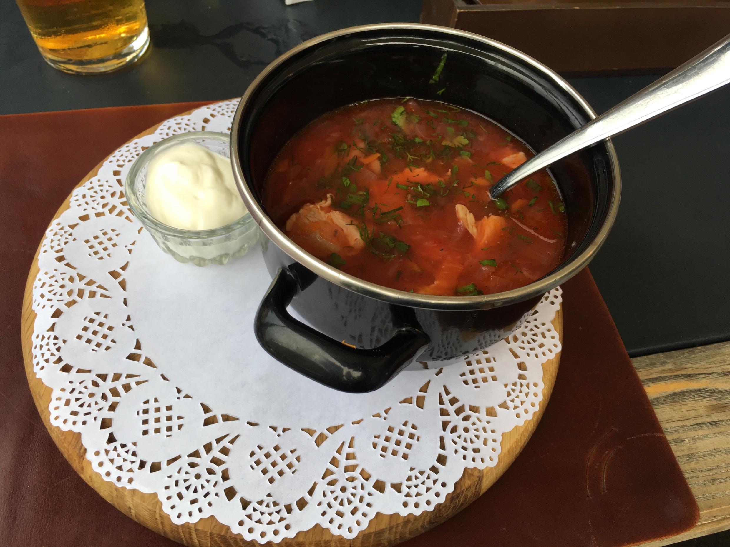 Nachdem wir unsere Runde mit etlichen Steigungen bewältigt hatten, läuteten wir mit Borsch, Schaschlik und Pivo den frühen Abend ein. Souvenirs für die Damen sind auch schon besorgt.
