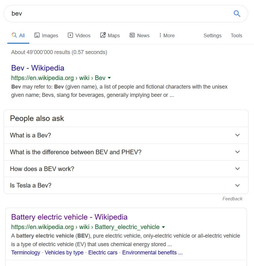 Und damit nicht alle nochmals im Netz suchen müssen und somit C02 Emissionen eingespart werden können, hier die Erklärung: BEV steht für: "Battery electric vehicle" und steht als 2. Eintrag in der Suche wenn man BEV eingibt.