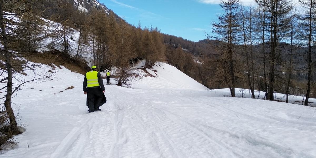 Auf halber Höhe den Pass wieder hinunter sehen wir einen Waldweg am Hang entlang nach Westen führen….lt. Navi müssten wir auf gleicher Höhe bleibend nach circa 8km auf die Auffahrt zum Passo di San Cristina treffen. Die Befahrung der Forststraße ist recht eindeutig als unzulässig markiert, jedoch nur für Autos und Motorräder. Da in Italien die Befahrung der Autobahnen erst ab 150ccm zulässig ist, gehen wir davon aus, dass unsere Moppeten entsprechend der Fahrradkategorie zugeordnet werden und eine Befahrung des Forstweges daher zulässig ist. Die einzige Schwierigkeit der ersten 4km liegt lediglich im Überfahren der quer verlaufenden Abwasserrinnen, was das Fahrwerk der Adressen inkl der Beladung regelmäßig an die Grenzen bringt. Eine folgende Steilauffahrt mit grobem Schotter und Schneeresten verlangt schon deutlich kundigere Hand….eine Kombination aus viel Schwung, erheblicher Schmerzfreiheit was die Materialbelastung betrifft sowie massiver Beinunterstützung bzw Schiebehilfe der Mitfahrer löst das Problem. Vorbei an momentan unbewohnten Almen geht es auf gleichbleibender Höhe mal mehr oder weniger schwierig. Kurz bevor der Forstweg wieder auf öffentlichen Verkehrsraum trifft steht noch ein vereister Aufschwung bevor. Selbst im Stand schlittern wir immer wieder zurück. Auch hier hilft nur viel Schwung, die Füße als Stabilisatoren ausgefahren, einer ziehend, einer schiebend als Unterstützung um die Passage zu meistern. Wir sind völlig außer Atem, brauchen erstmal eine Pause….körperliche Schwerstarbeit und diverse Schichten Kleidung passen einfach nicht zusammen. Endlich sind wir wieder auf Asphalt….so schnell können sich die Prioritäten ändern. Wir cruisen die letzten 2km den Pass hinauf und finden schnell die Abfahrt ins Tal….und wieder so ein weiss/rotes Schild…was das immer soll. Wir passieren und treffen 2km weiter auf den Grund. Die Straße ist nicht geräumt, der Schnee liegt gute 40cm hoch im Schatten der Bäume. Diverse Autos scheinen jedoch schon passiert zu haben, was die Reifenspuren verraten. Auch Googlemaps sagt, dass die Straße ab hier nurnoch abschüssig verläuft….wir versuchen es. Die ersten 100mtr auf der geschlossenen und verspurten Schneedecke sind herausfordernd. Immer wieder bricht das Vorderrad aus und will woanders hin als wir es wollen. Die ausgefahrenen Stabilisatoren verhindern, dass wir uns sofort lang machen…das ein oder andere Mal geschieht es aber dennoch. Der Schnee ist weich und die Satteltaschen fangen das Meiste ab. Nach 1km wird die Straße deutlich abschüssig und der Schnee weniger…das ist gut! Weniger gut ist, dass sich anstatt des Schnees eine feine Eisschicht auf den Teer gelegt hat, die jegliche Korrektur der Fahrtrichtung unmöglich macht. So schlittern wir mehr oder weniger kontrolliert den Hang hinab, manchmal mit den Reifen auf Eis, manchmal mit den Seitentaschen auf Eis. Nach weiteren 2km passieren wir ein Dorf, von wo an die Straße deutlich besser geräumt ist und wir wieder Geschwindigkeiten jenseits der 20km/h erreichen.
