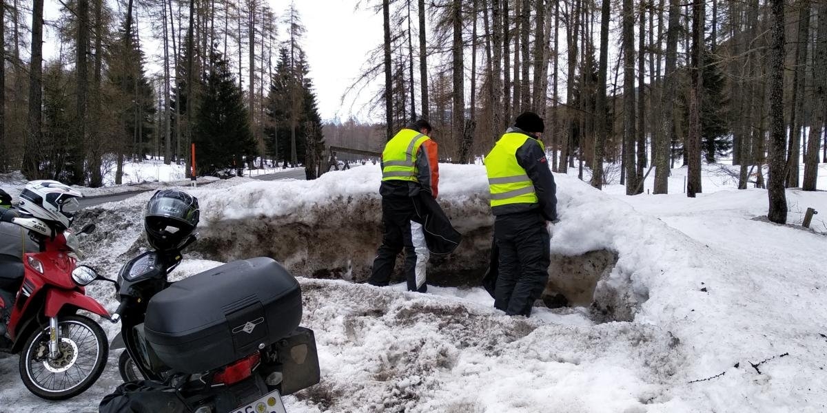Da wir zeitlich gut unterwegs sind reift hier der Gedanke, dass wir uns die Schotterpässe der Region anschauen könnten…den Passo del Spina habe ich noch in guter Erinnerung und halte ihn für die Cubs für sehr geeignet. Also fahren wir nach Anfo und biegen dort ab um die ettlichen Sepentinen aufwärts zu fahren. Auf halber Höhe lässt uns die geschlossene Schranke mit einem weiss/roten Schild (italienisch für herzlich willkommen) wissen, dass wir als Autofahrer an dieser Stelle umkehren sollten, als Zweiradfahrer jedoch durch dürfen. Die Kehren sind ab diesem Punkt nichtmehr geräumt und die Auffahrt wird spannender. Wenige hundert Meter später an einem kurzen Anstieg kommen erstmals unsere Schneeketten zum Einsatz, da ein Weiterkommen sonst nichtmehr möglich wäre. Aber auch diese bringen nur wenig Besserung und die Spur will gut gewählt sein um nicht in einer Schneewehe hängen zu bleiben. So kämpfen wir uns Meter um Meter weiter bis der mittlerweile geschotterte Weg (aus meiner Erinnerung, es ist alles voll Schnee) in den Schatten des nahen Berges führt. Nurnoch mit Mühe und gemeinsamem Schieben und Zerren schaffen wir es die Addressen durch den immer höher werdenden Schnee zu bewegen...so werden wir nie ankommen….der Höhenweg geht so über mehrere Kilometer. Also treten wir nach kurzer Beratung den Rückzug an und werden versuchen über den Passo Croce Domini entweder via Passo Maniva oder direkt über das Caffaro-Tal auf „die andere Seite“ zu kommen. Die Passschilder lassen jedoch wenig Gutes hoffen, sowohl Maniva, also auch Croce Domini sollen gesperrt sein!??? ….kann nicht sein….es ist doch warm. Wir fahren einige Kilometer taleinwärts, befragen diverse Passanten um uns final vom Postboten überzeugen zu lassen, dass definitiv kein Durchkommen ist weil die Straßen nicht geräumt sind und eher mehr als weniger Schnee wie auf dem Passo Spina liegen wird.