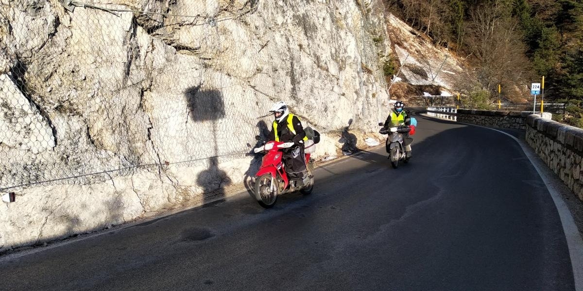 Auf halber Höhe den Pass wieder hinunter sehen wir einen Waldweg am Hang entlang nach Westen führen….lt. Navi müssten wir auf gleicher Höhe bleibend nach circa 8km auf die Auffahrt zum Passo di San Cristina treffen. Die Befahrung der Forststraße ist recht eindeutig als unzulässig markiert, jedoch nur für Autos und Motorräder. Da in Italien die Befahrung der Autobahnen erst ab 150ccm zulässig ist, gehen wir davon aus, dass unsere Moppeten entsprechend der Fahrradkategorie zugeordnet werden und eine Befahrung des Forstweges daher zulässig ist. Die einzige Schwierigkeit der ersten 4km liegt lediglich im Überfahren der quer verlaufenden Abwasserrinnen, was das Fahrwerk der Adressen inkl der Beladung regelmäßig an die Grenzen bringt. Eine folgende Steilauffahrt mit grobem Schotter und Schneeresten verlangt schon deutlich kundigere Hand….eine Kombination aus viel Schwung, erheblicher Schmerzfreiheit was die Materialbelastung betrifft sowie massiver Beinunterstützung bzw Schiebehilfe der Mitfahrer löst das Problem. Vorbei an momentan unbewohnten Almen geht es auf gleichbleibender Höhe mal mehr oder weniger schwierig. Kurz bevor der Forstweg wieder auf öffentlichen Verkehrsraum trifft steht noch ein vereister Aufschwung bevor. Selbst im Stand schlittern wir immer wieder zurück. Auch hier hilft nur viel Schwung, die Füße als Stabilisatoren ausgefahren, einer ziehend, einer schiebend als Unterstützung um die Passage zu meistern. Wir sind völlig außer Atem, brauchen erstmal eine Pause….körperliche Schwerstarbeit und diverse Schichten Kleidung passen einfach nicht zusammen. Endlich sind wir wieder auf Asphalt….so schnell können sich die Prioritäten ändern. Wir cruisen die letzten 2km den Pass hinauf und finden schnell die Abfahrt ins Tal….und wieder so ein weiss/rotes Schild…was das immer soll. Wir passieren und treffen 2km weiter auf den Grund. Die Straße ist nicht geräumt, der Schnee liegt gute 40cm hoch im Schatten der Bäume. Diverse Autos scheinen jedoch schon passiert zu haben, was die Reifenspuren verraten. Auch Googlemaps sagt, dass die Straße ab hier nurnoch abschüssig verläuft….wir versuchen es. Die ersten 100mtr auf der geschlossenen und verspurten Schneedecke sind herausfordernd. Immer wieder bricht das Vorderrad aus und will woanders hin als wir es wollen. Die ausgefahrenen Stabilisatoren verhindern, dass wir uns sofort lang machen…das ein oder andere Mal geschieht es aber dennoch. Der Schnee ist weich und die Satteltaschen fangen das Meiste ab. Nach 1km wird die Straße deutlich abschüssig und der Schnee weniger…das ist gut! Weniger gut ist, dass sich anstatt des Schnees eine feine Eisschicht auf den Teer gelegt hat, die jegliche Korrektur der Fahrtrichtung unmöglich macht. So schlittern wir mehr oder weniger kontrolliert den Hang hinab, manchmal mit den Reifen auf Eis, manchmal mit den Seitentaschen auf Eis. Nach weiteren 2km passieren wir ein Dorf, von wo an die Straße deutlich besser geräumt ist und wir wieder Geschwindigkeiten jenseits der 20km/h erreichen.