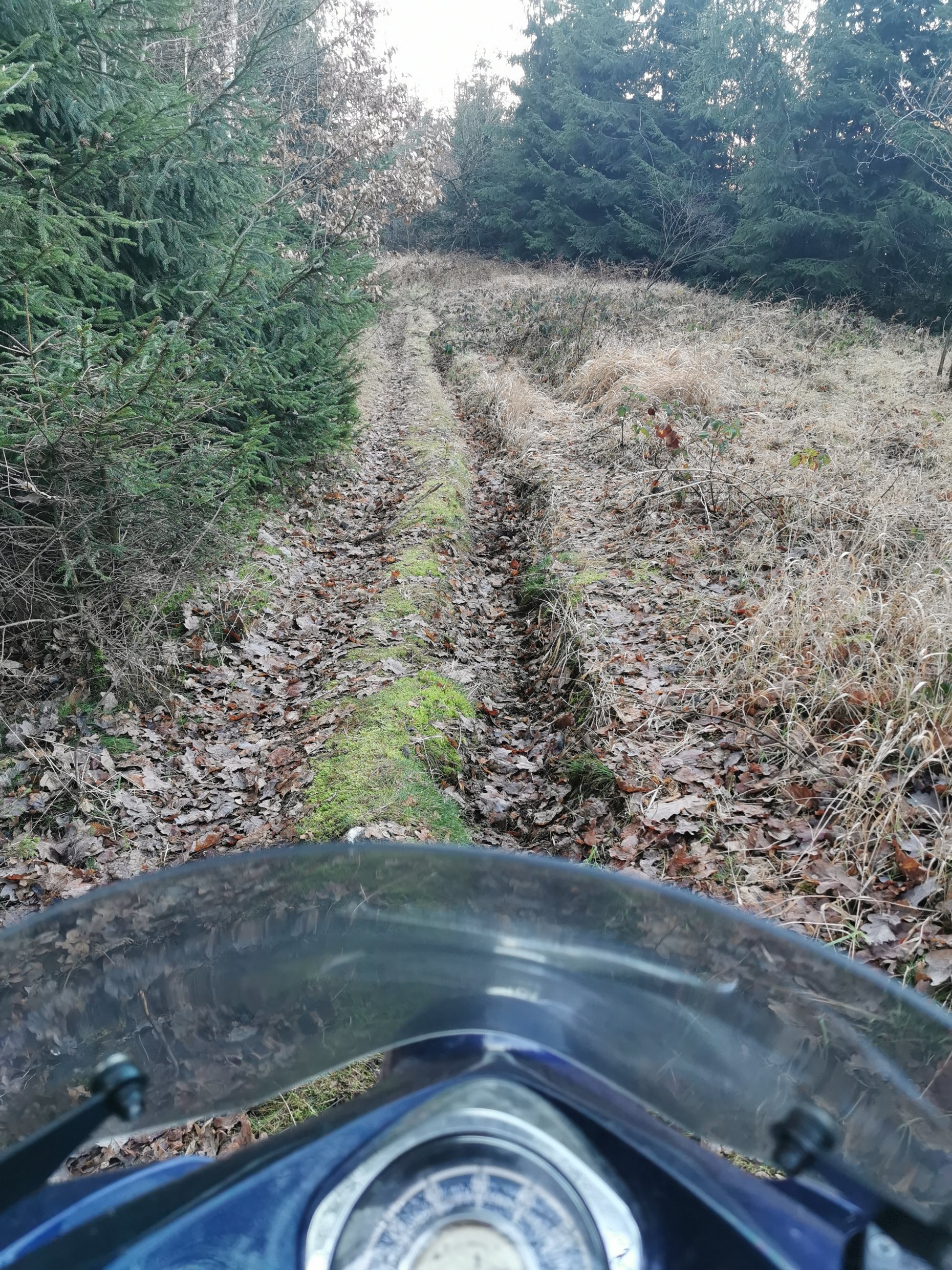 Ich bin ca einen KM in so einer tiefen Spurrille gefahren, das Beinschild kratzte dabei. Auch raus aus der Rille kam ich durch den minderen Gripp der Reifen nicht, nur mit deutlichem Körpereinsatz. Das ist der Gesamtvorteil der Cub: sie ist leicht! Wo ich überrascht war: wie gut sich die Halbautomatik im Gelände macht.