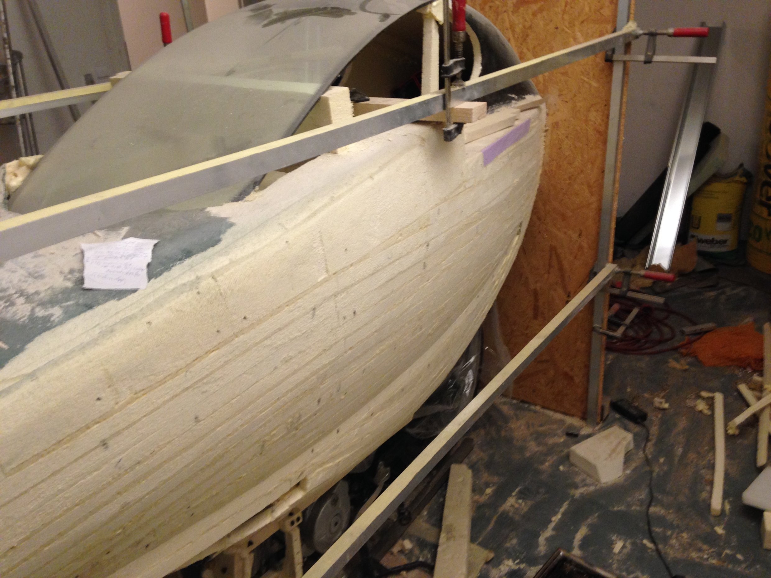 Nachdem die rechte Seite fertig war, habe ich ein Käfig um die Wave gebaut und mit Hilfe eines billig Lasers die Oberflächen Daten auf die linke Seite projiziert.Das ist recht einfach zu machen, allerdings sehr mühselig. Jeder Oberflächenpunkt ist durch drei Raumkoordinaten definiert. Also muss ich um einen Oberflächenpunkt von der rechten Seite auf die linke Seite zu übertragen, drei mal auf der rechten Seite und drei mal auf der linken Seite Messen. 10 Rippen mit jeweils 20 Punkten ergeben 200 Punkte. In Summe 1200 Messungen.