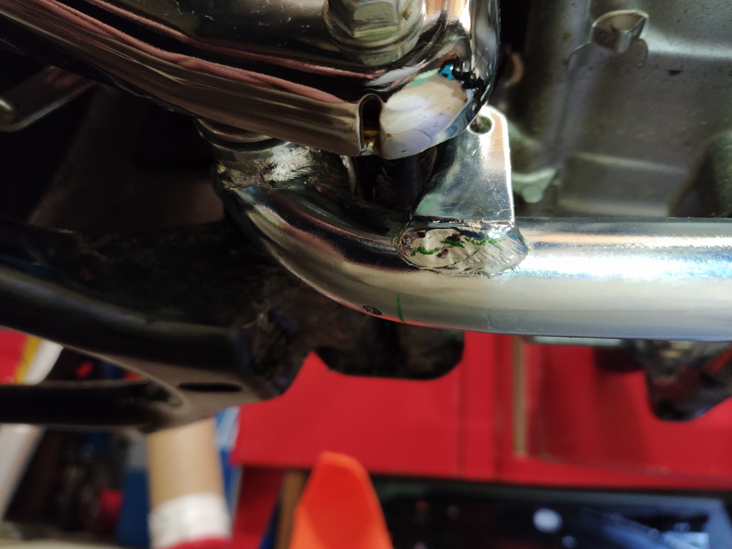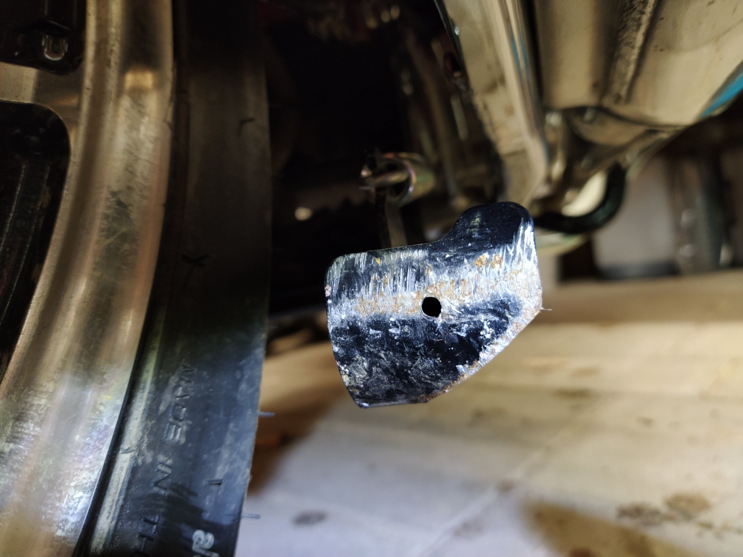 "So nun zu den Fotos man kann sehen das es eine Öffnung an der Trägernunterseite ( vom Auspuff ) gibt damit evtl. eindringende Feuchtigkeit dort wieder austreten kann. So das keine Feuchtigkeit drin bleiben kann. Der das Material nur von außen behandelt ist und nicht von innen behandelt ist kann es schon mal passieren das die Feuchtigkeit die austritt leicht röstlich ist.