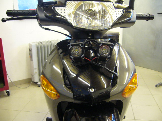 Ich habe mir eine LED-Arbeitsleuchte angebaut und bin sehr zufrieden. Das dunkle Loch zwischen Vorderrad und Lichtkegel der Originallampe ist verschwunden. Das Licht streut auch genug zur Seite und man wird besser wahrgenommen. Die Eintellung muß, wie von Richard beschrieben, wie bei den Solstice erfolgen, da sonst der Gegenverkehr geblendet wird.