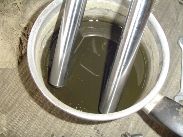 Sich die Gabel genauer anzuschauen. Öl oder das was für eine Brühe drinnen ist raus lassen. Geht ganz einfach, einfach an die Schraube am unteren Seite der Gabel aufschrauben und Öl ablassen, hilfreich dabei die Einfüllschraube oben öffnen, damit die Brühe leichter rauslaufen kann.