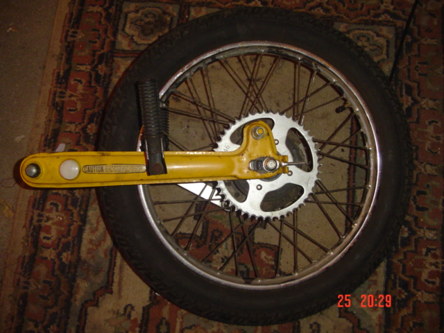 Die Felge hier ist einer von einer Honda CB 50 J, eigentlich eine die auch bei verschiedenen CT 90 bzw CT 110 Modellen zum Einsatz kam. Es gibt auch andere die an der CT 90 verbaut wurden, die haben den Vorteil, das die Kette nicht bei einem Radwechsel abgenommen werden muss. Nachteil die Kettenräder sind fast doppelt so teuer, wie die die an der Dax, Chaly, CY 50 u.a. verbaut wurde. Dazu kommt die größere Auswahl an Kettenrädergrößen.