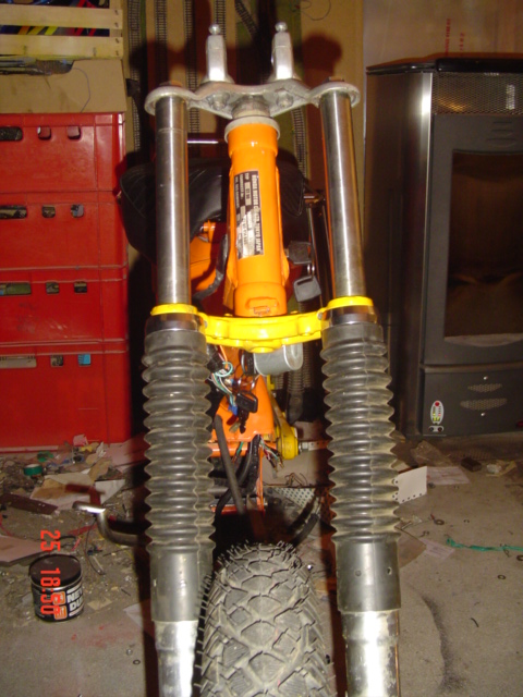 Die nächste Baugruppe ist die Gabel, dazu nehme man ein Testbike, hier meine orange CT 90 Baujahr 1974 die in der nächsten Zeit mit einem original 8gang Motor ausgerüstet wird. Teilweise fertig, aber momentan werden halt Baugruppen gebaut.