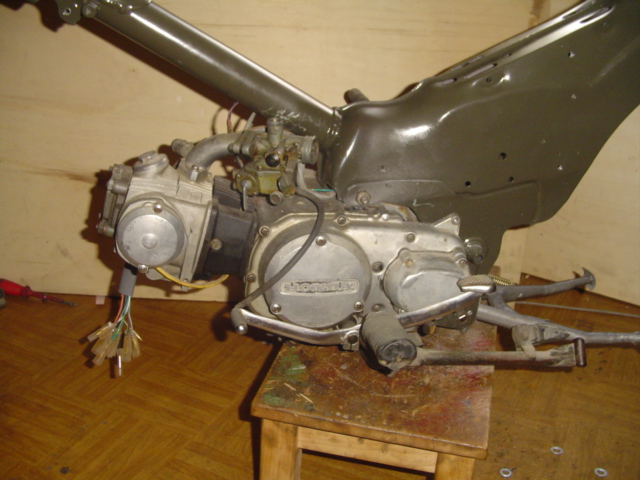 Egal ich hab sie ja schon mal gebaut und wieder zerlegt um ihr ein anderes Farbkleid zu geben. Sie wurde bereits 2013 als 125er getüvt. Wird jedoch etwas anders gebaut als es in den Papieren steht, den sie bekommt einen Honda CT 90 Motor samt Untersetzungsgetriebe verpasst. Der Motor hat eine Laufleistung von ca 12000 Meilen, zeigte der Tacho an aus der ich sie ausgebaut habe.