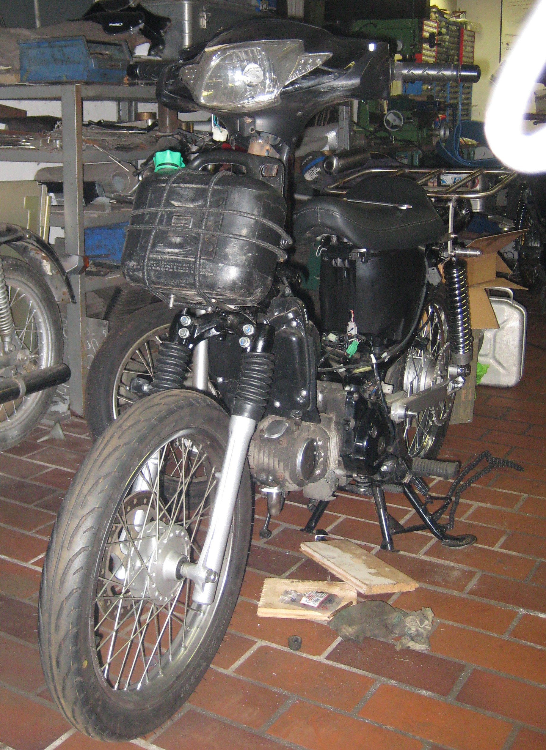 - selbstgeschweißter klappbarer Rohr-Gepäckträger über dem Tank für´s Gepäck