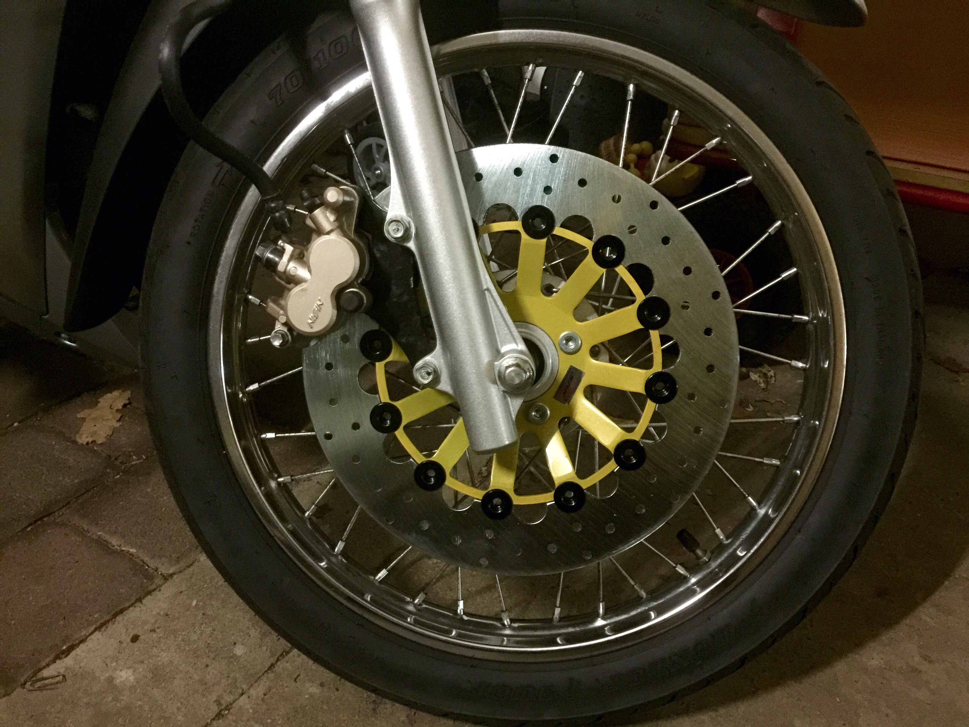 Die Frage ist ob man Grosse oder Kleine(Normale) Bremsscheiben nehmen soll..Ist immer ein Hexenwerk a la Buell mit seiner fast Rad-Grossen Bremse...