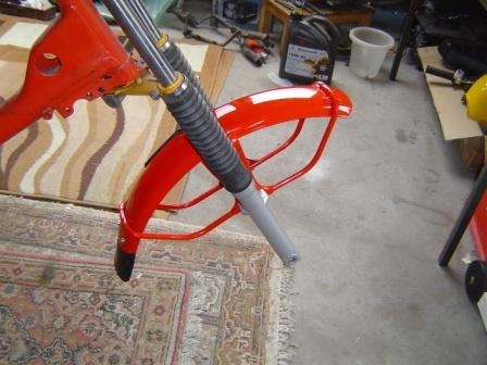 Neues Schutzblech, das neubezogene Vorderrad mit Heidenaureifen. Beim Einbau mit Fett nicht sparsam sein.