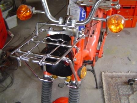 Also ging es weiter, der neue Gepäckträger wurde verbaut, Metall Lampengehäuse angeschraubt, Lenker verbaut, der Kabelbaum eingesetzt und der Motor wieder verbaut.