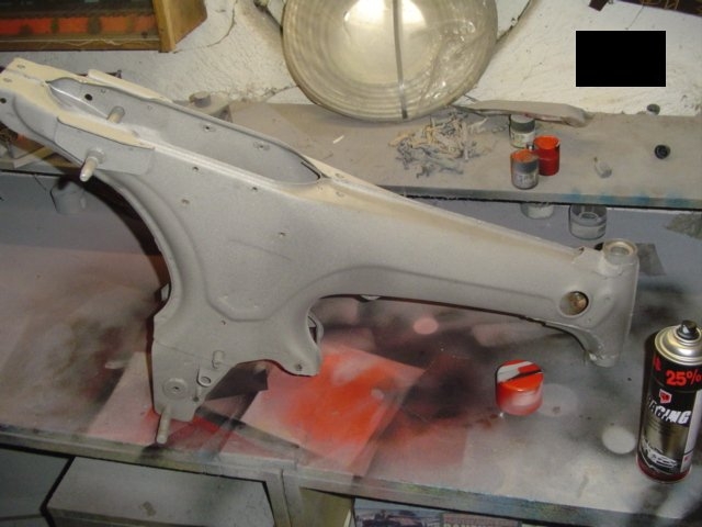 Typenschildaufkleber und Seitenschilder wurden mit Benzinfesten Klarlack überspritzt. Die original Lackschwinge wurde mit Klarlack versiegelt, damit sie nicht so schnell rostet und der Glanz vom ausgedrockneten Klarlack wiederzurück kommt.