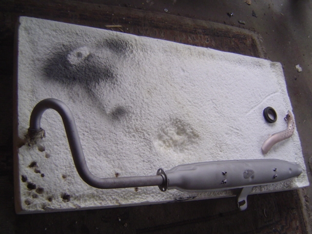 Die Auspuffanlage wurde nach dem sandstrahlen mit 4 neuen Muttern versehen, damit die 6 Volt Honda Dax Auspuffblende angeschraubt werden kann. Der Auspuff hat eine E-Nummer ist für 125ccm gut und steht auch in den Papieren. Anschließend wurde er kräftig mit schwarzen Auspufflack lackiert. Die E-Nummer wurde ausgespart und mit hitzebeständigen Klarlack lackiert. Die Krümmerblende wurde mit silberfarbigen Auspufflack lackiert.
