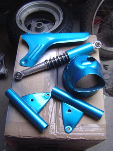 Die Dax wurde dazu komplett zerlegt, der verbaute Lifan Motor wandert in eine andere Dax. Der Rahmen, Lampengehäuse und die Lampenhalter sind zwischenzeitlich sandgestrahlt und werden gerade mit der Farbe candy blue green von RH Lacke in einem Schweinfurter Lackierbetrieb lackiert.