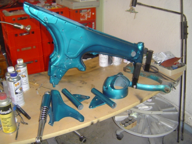 Mit RH Lack PB-2 C-S Candy Blue Green lackieren lassen, für die Teile Rahmen, beide Lampenhalter und das Metalllampengehäuse wurde eine Dose315ml benötigt.
