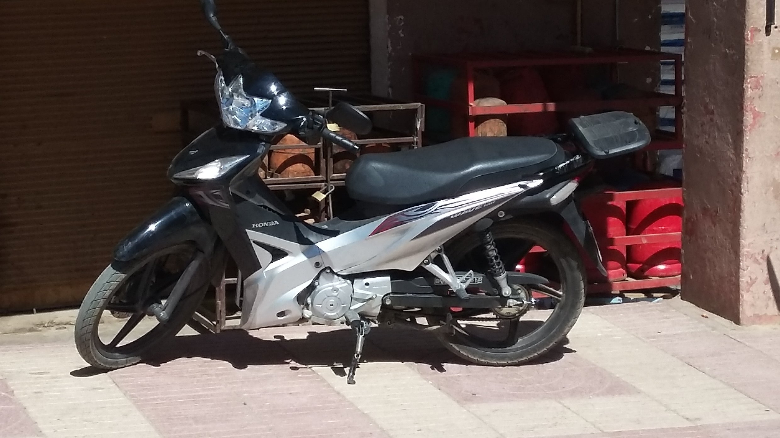 In Tafraout /MA. Die gehört einem Franzosen und auf der anderen steht "New Wave". Hinten Scheibenbremse. Ccm?
