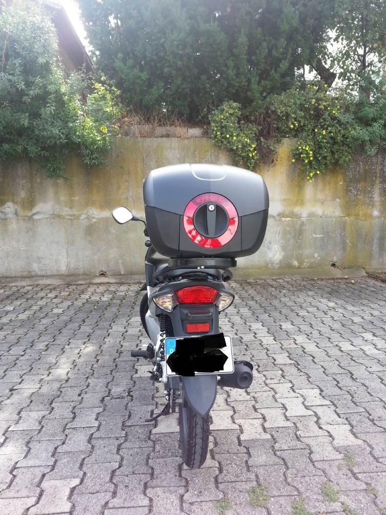 Das Topcase finde ich ziemlich passend. Großer Öffnungsgriff. Der Deckel springt nach Drehbetätigung des Griffes selbsttätig auf.